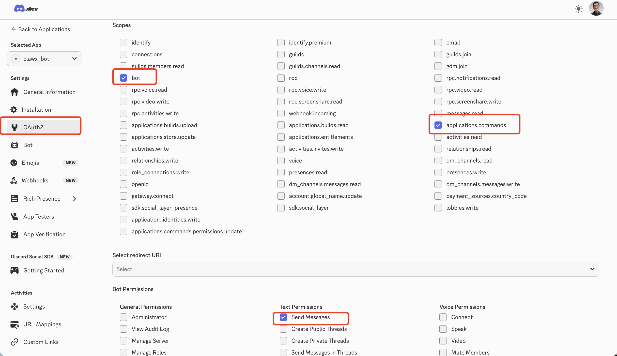 In OAuth2 → URL Generator, select bot + applications.commands, and check Send Messages and other message permissions.