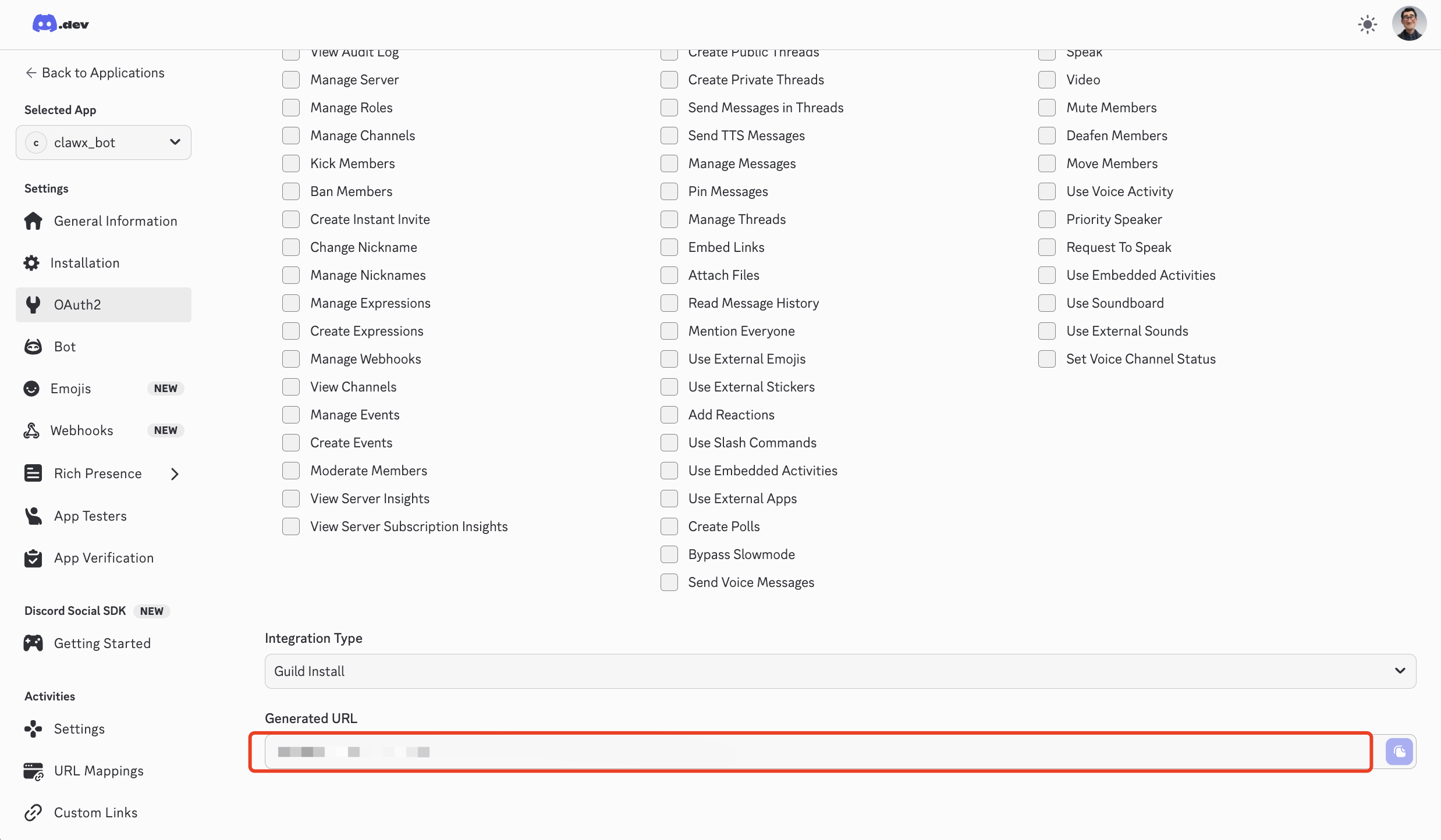 Use the generated URL to invite the bot to your server.