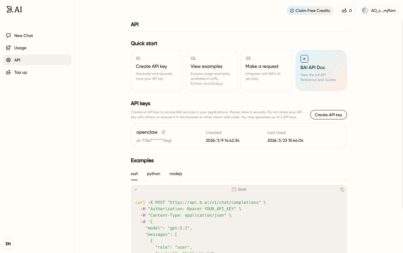 要使用 BAIclaw,你需要从 BAI 获取 API 密钥。该密钥用于验证你的请求并授予访问大语言模型能力的权限。